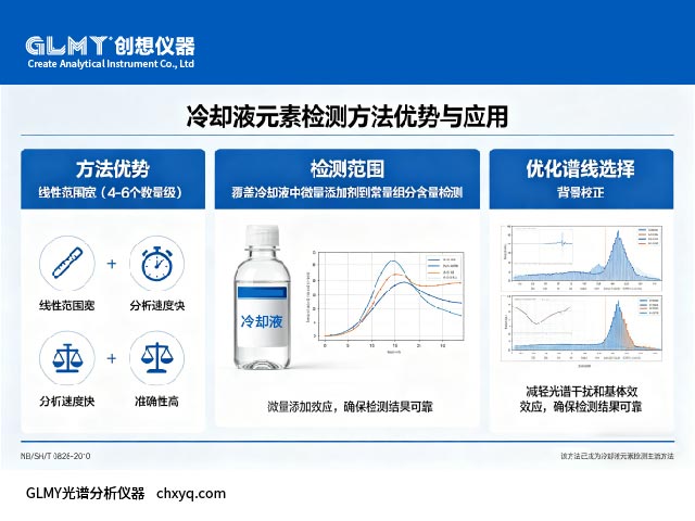 該方法具有線性范圍寬(4-6個數量級)、分析速度快、準確性高的優勢,能覆蓋冷卻液中從微量添加劑到常量組分的含量檢測,同時可通過優化譜線選擇、背景校正等手段,減輕光譜干擾和基體效應,確保檢測結果可靠。目前,該方法已被納入相關行業標準(如NB/SH/T 0828-2010),成為冷卻液元素檢測的主流方法。